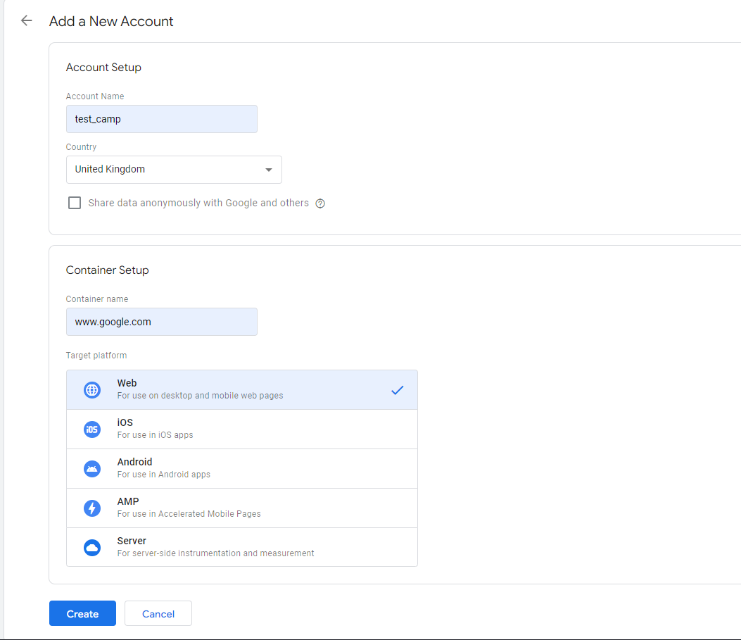 Create a new tracking account, enter a name, country and select a platform for tracking (in our case Website)