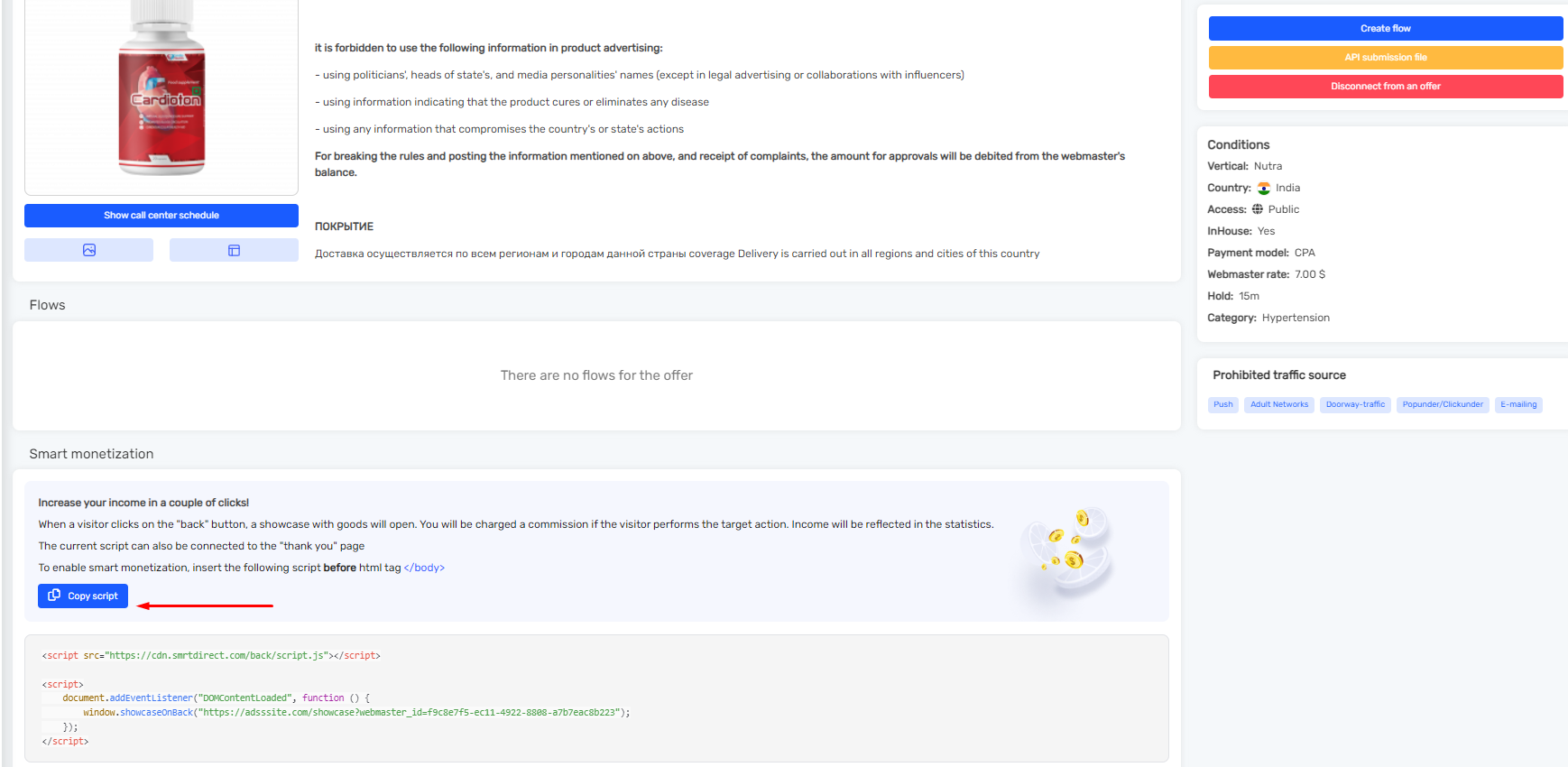 When a visitor clicks on the "back" button, a showcase with goods will open. You will be charged a commission if the visitor performs the target action. Income will be reflected in the statistics.