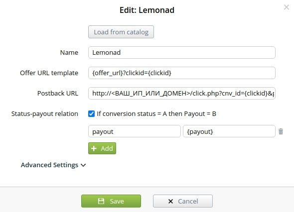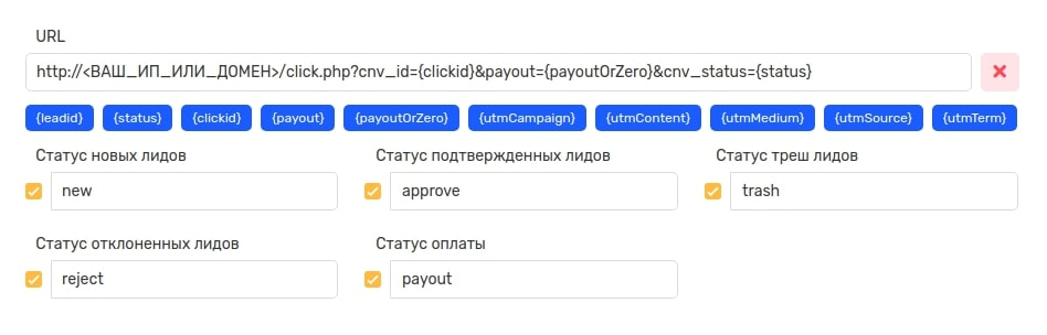 PostbackURL: http://<ВАШ_ДОМЕН>/click.php?cnv_id={clickid}&payout={payoutOrZero}&cnv_status={status}