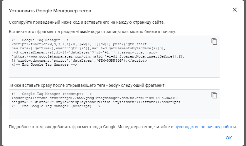После создания появится окошко с кодом, его необходимо вставить в ленд, следуя инструкции.