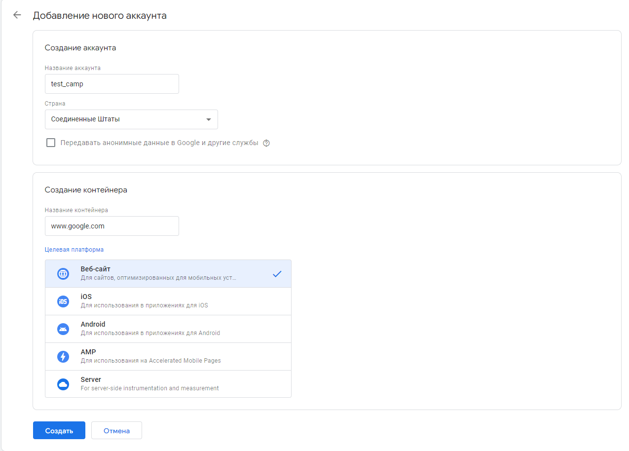 Создайте новый кабинет отслеживания, введите имя, страну и выберите платформу для отслеживания (в нашем случае Веб-сайт).