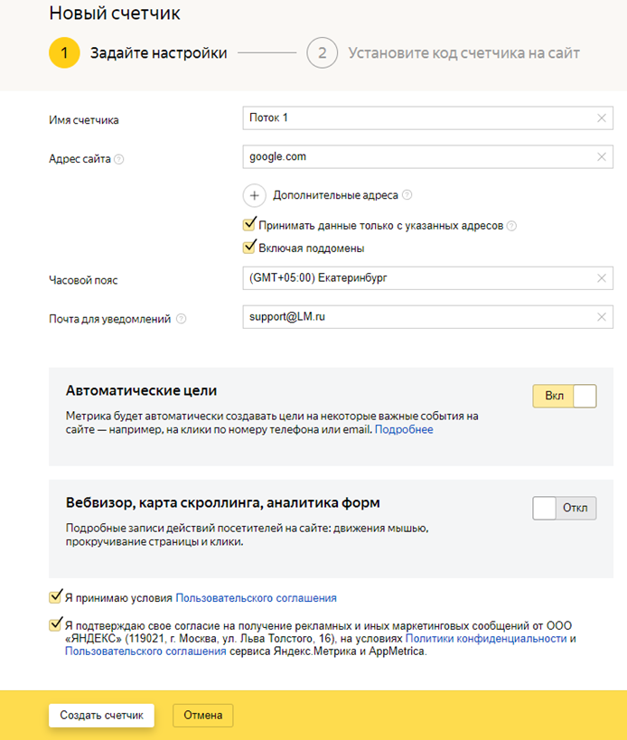 Введите данные, нажмите “Создать счетчик”.