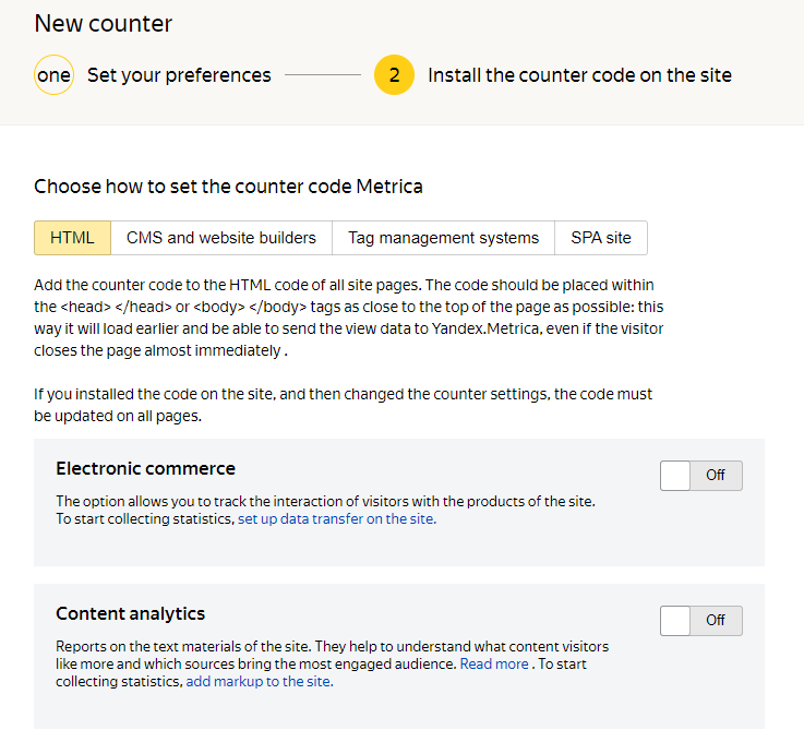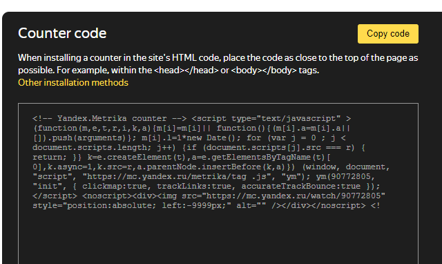We select the necessary method, in this case HTML. Copy the code at the bottom of the page, put it in the <HEAD> tag